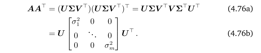 step4: (这步中间有些细节不懂,就这样吧。) 现在我们借助对\(A^TA\)和\(AA^T\)的eigendecomposition,得到了A的\(U\)、\(V^T\)和\(\Sigma\)。如果只是只是为了求A的SVD,那我们现在已经算完了。 但我们现在另外再来探索一下U和V的关系。
