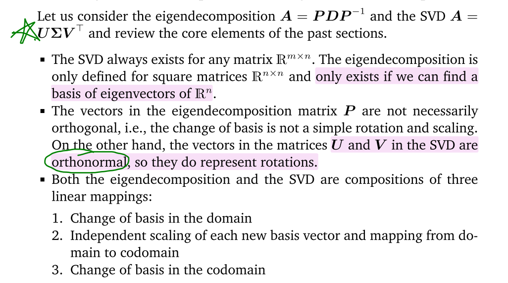 - eigendecomposition的eigenvector不一定orthogonal。SVD的U和V中的向量一定是orthonormal的,因此描述的一定是旋转操作。
