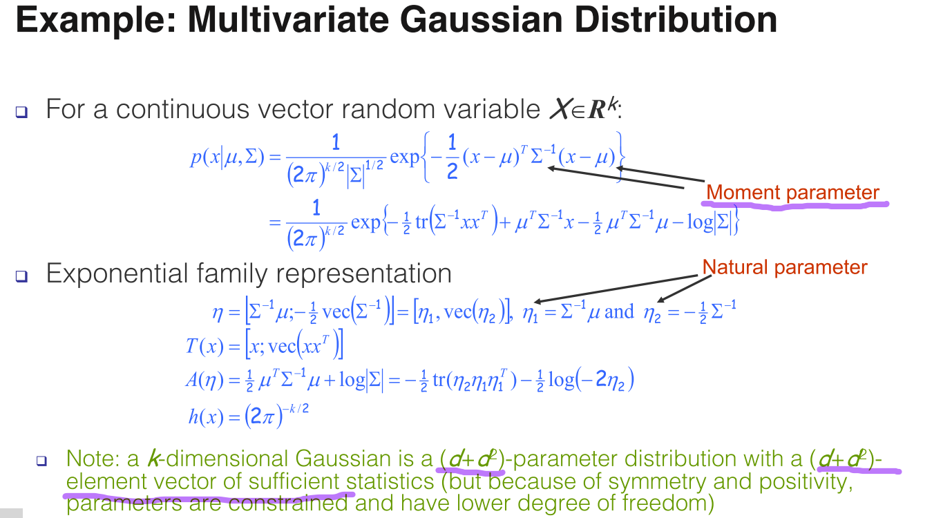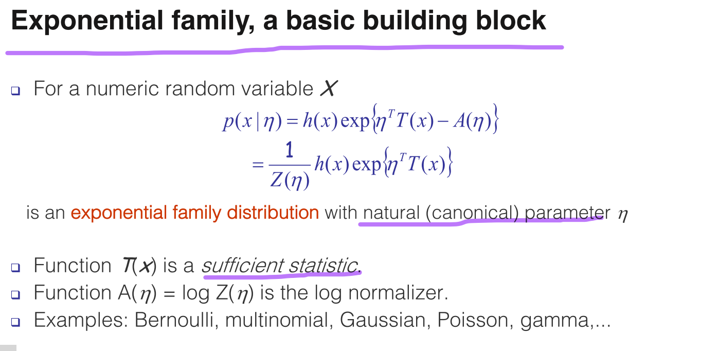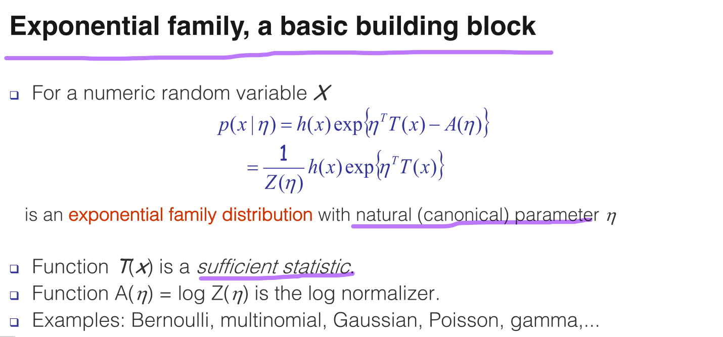 natual parameter和sufficient statistic是最重要的部分,它们之间做的是inner product操作,是linear dependent的。