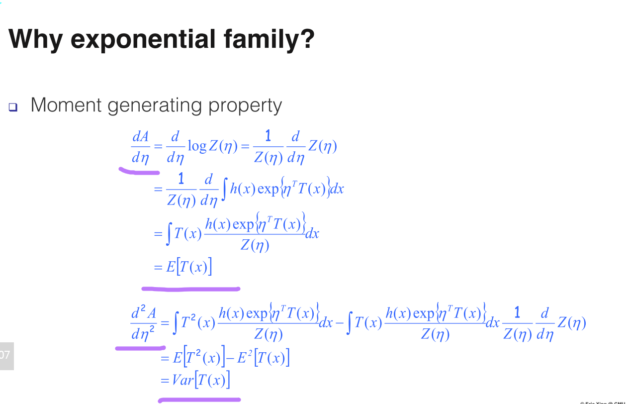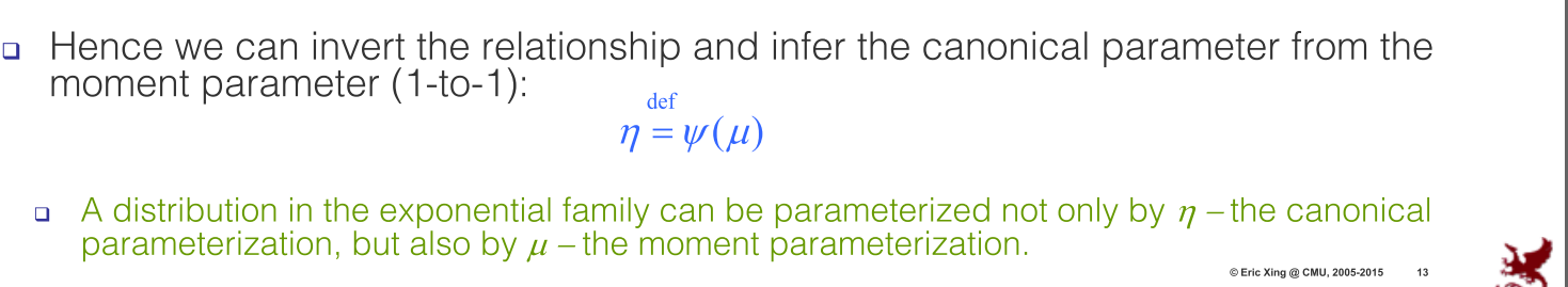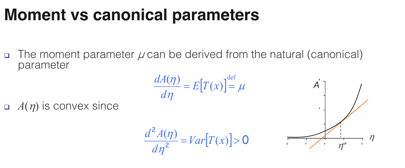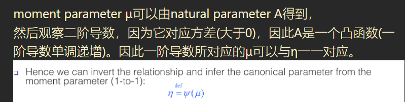 然后观察二阶导数,因为它对应方差(大于0),因此A是一个凸函数(一阶导数单调递增)。因此一阶导数所对应的μ可以与η一一对应。