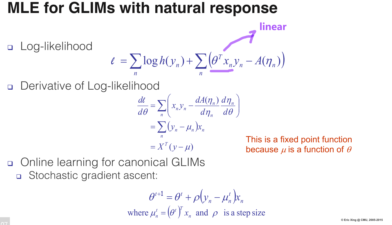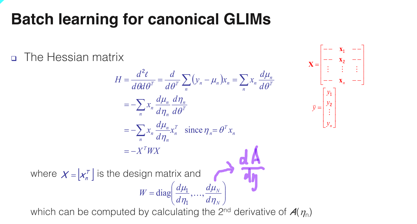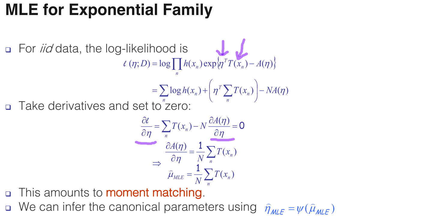 在对exponential family的MLE中,我们们可以直接运用上面\(\frac{dA(\eta)}{d\eta}=\mu\) 这一性质,简便地得到\(\mu_{MLE}\).