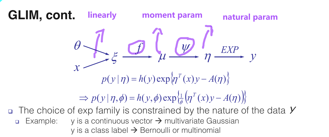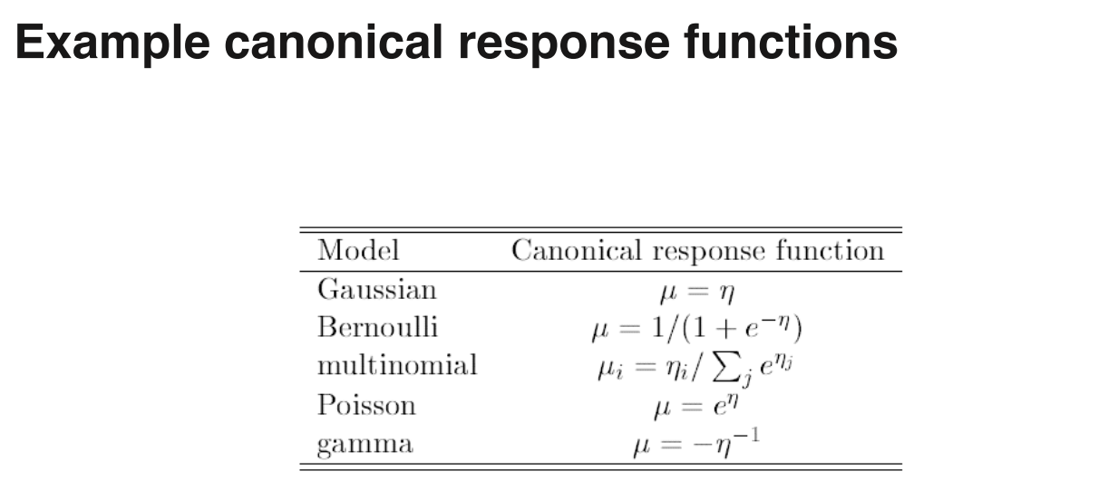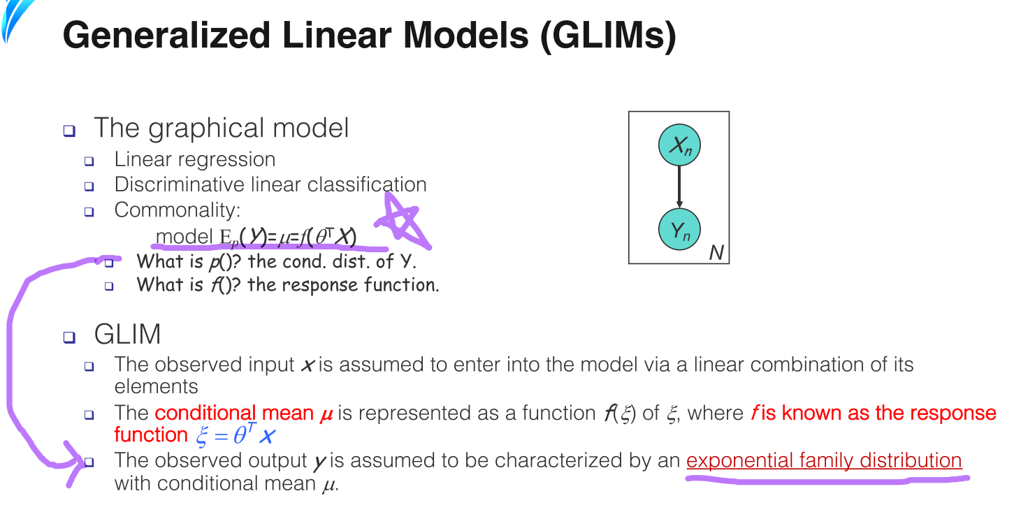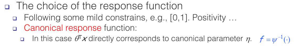 通常对于X施加一个response function f(),然后对于\(\mu=f(X)\)施加一个exponential family,来描述Y