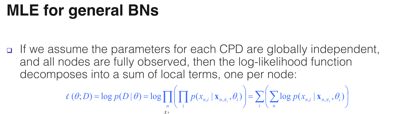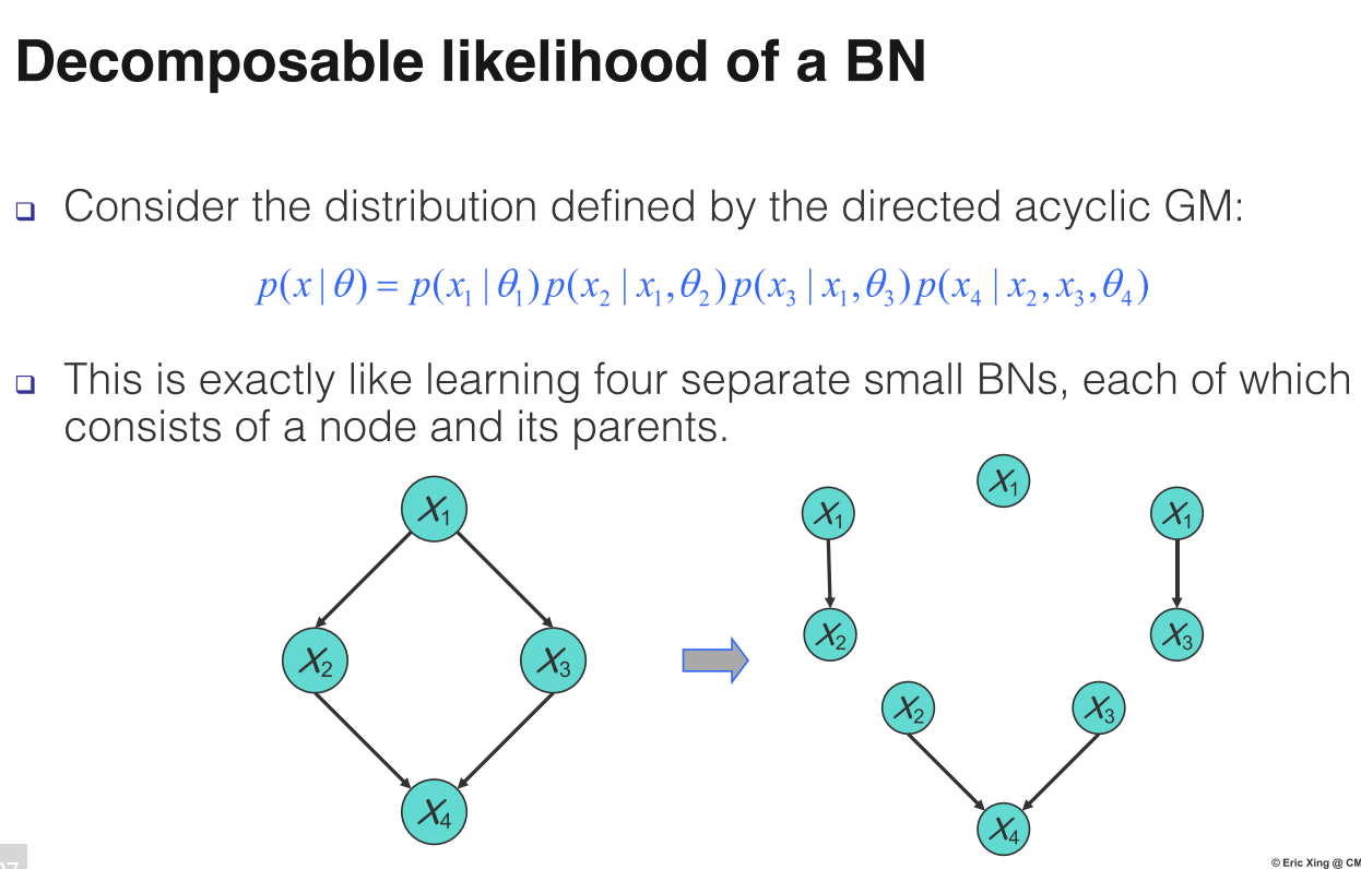 注意上图中如果一个node有两个parent,那么这两个node的影响往往还是可以写成相乘的关系,那么在log likelihood中就成为了相加的关系。