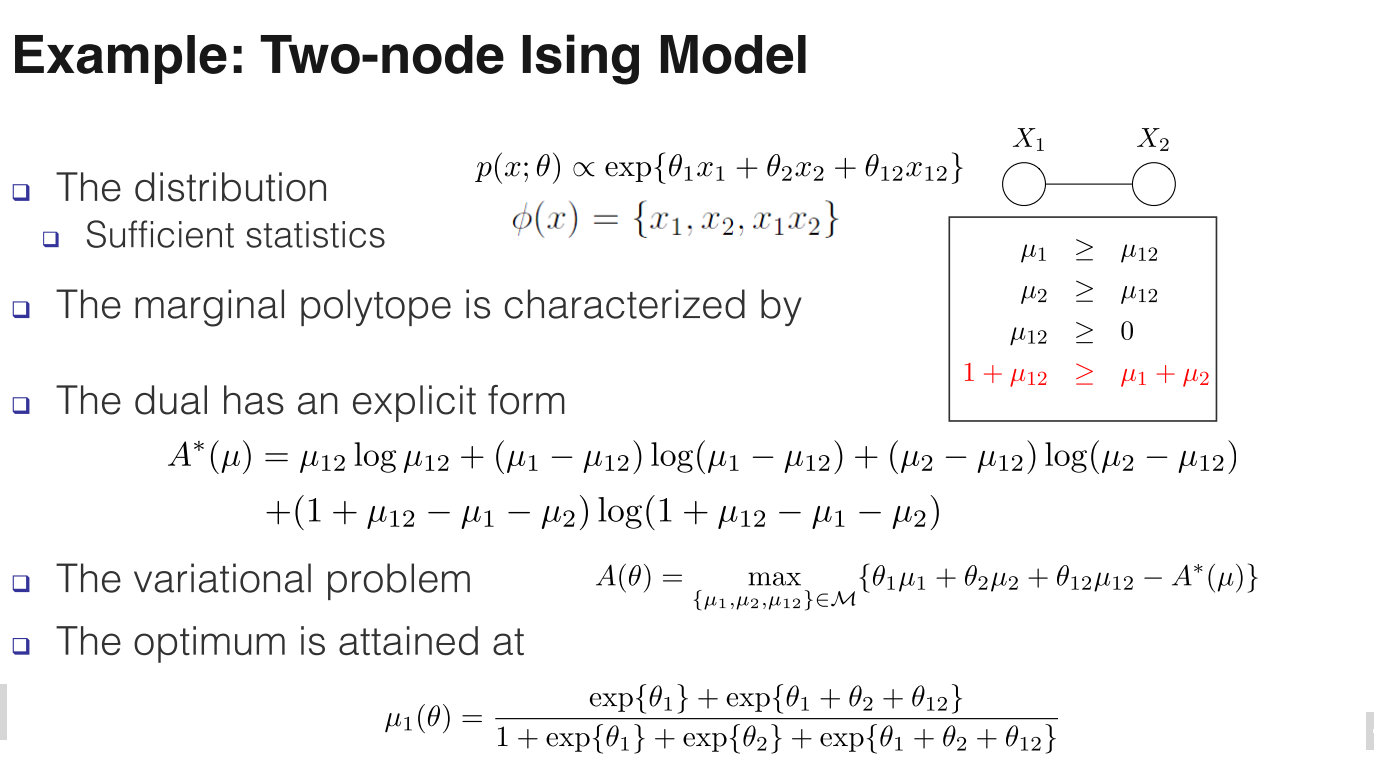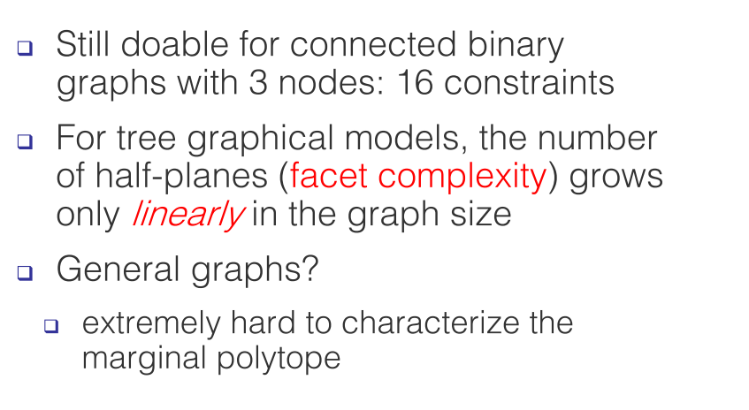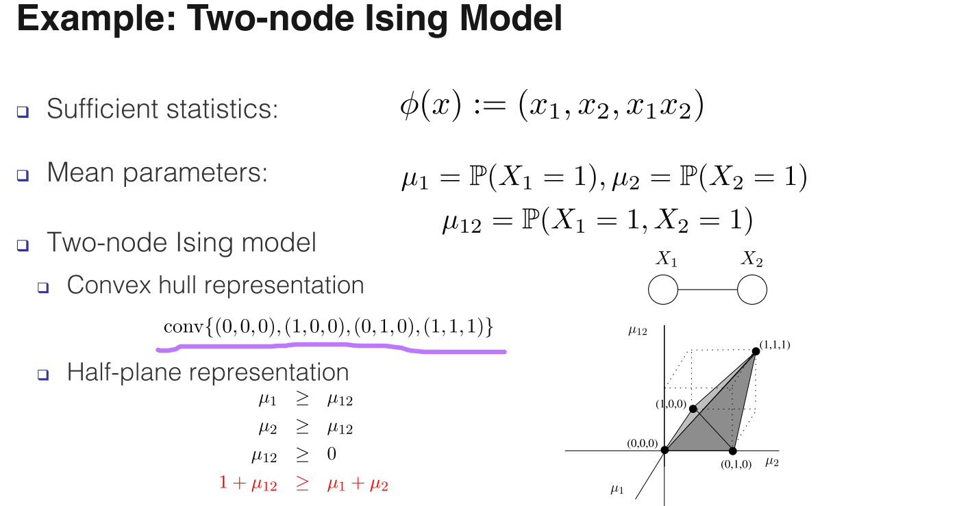 这里我们把sufficient statistics设为singleton和pairwise的拼接,可以看到最终结果是φ的极值点所构成的convex hull,而且可以进一步写成4个不等式。