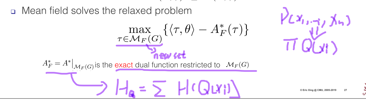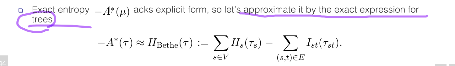 当我们去掉了所有的边,我们就是用所有变量在Q上的margin的连乘去近似整个joint,由此我们可以直接写出A*,也就是这个近似的entropy,其实等于所有变量在Q上的margin的extropy之和。